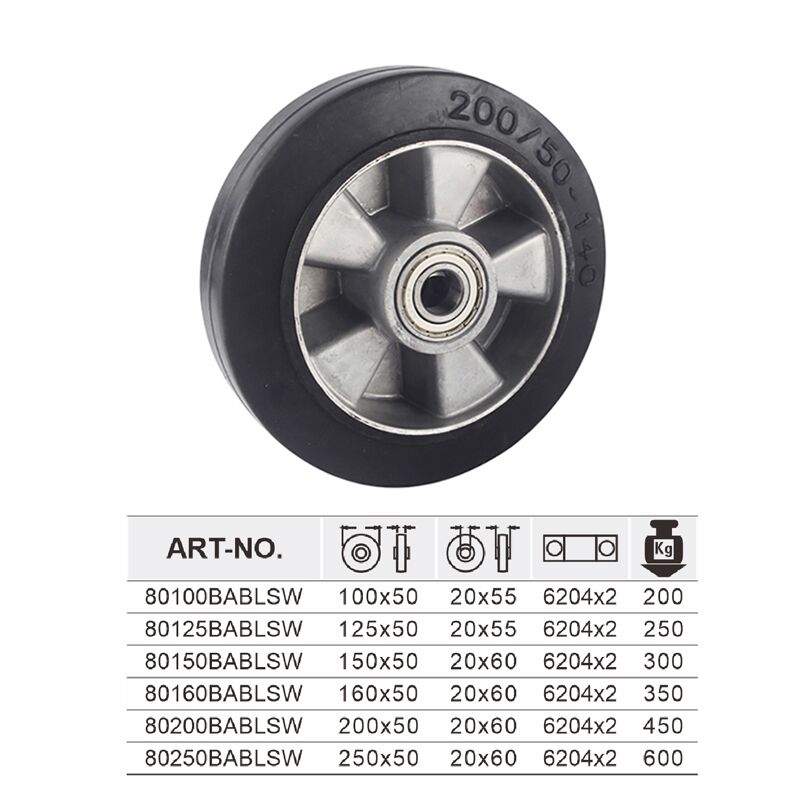 We offer a full range of sizes for these aluminum core elastic rubber wheels, with a load capacity of up to 600 kg per wheel. Featuring excellent shock absorption, low noise and good resistance to water and mild abrasion, they are well-suited for indoor and outdoor material handling.